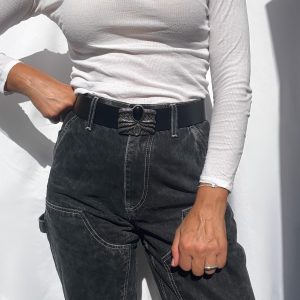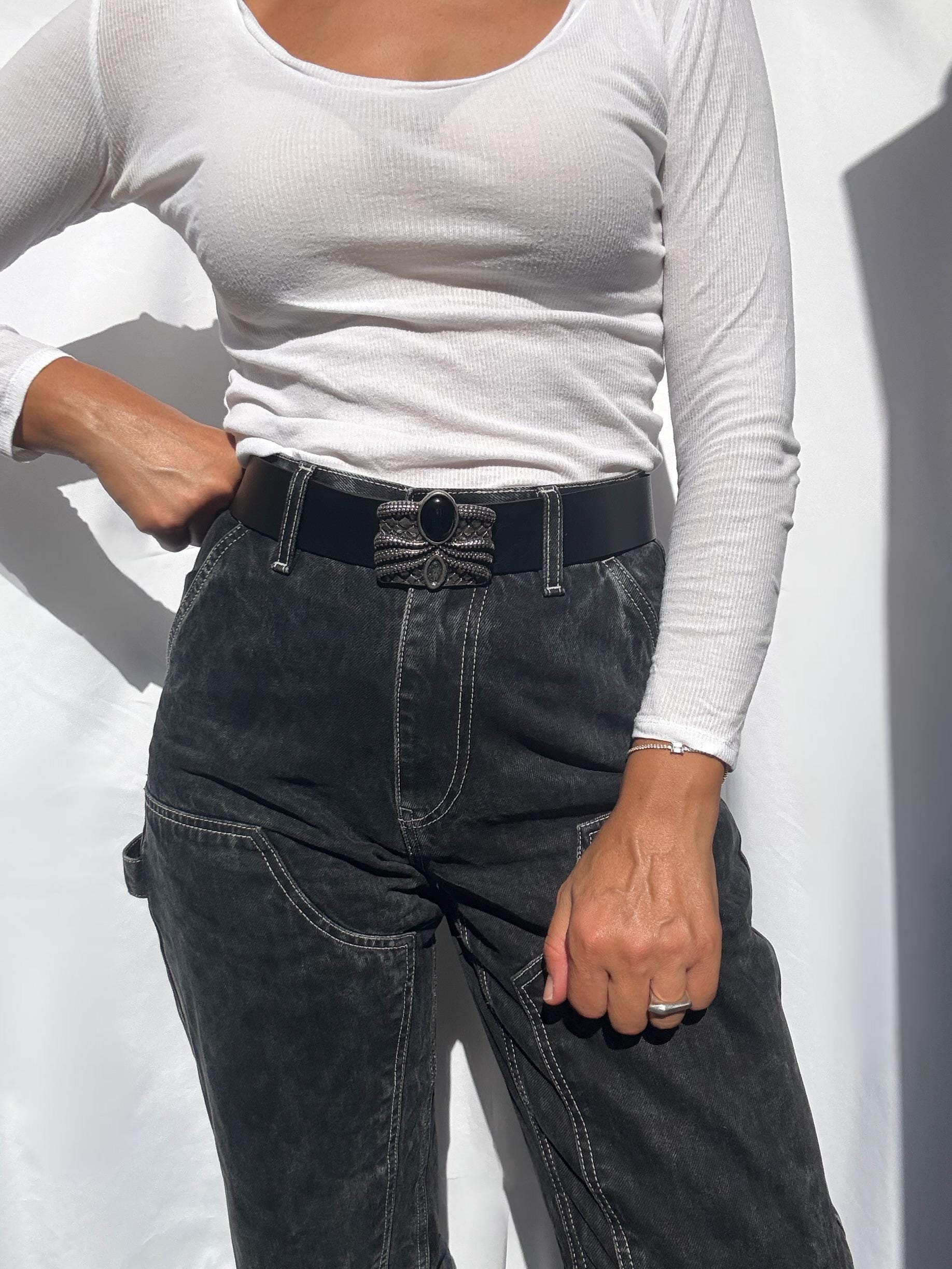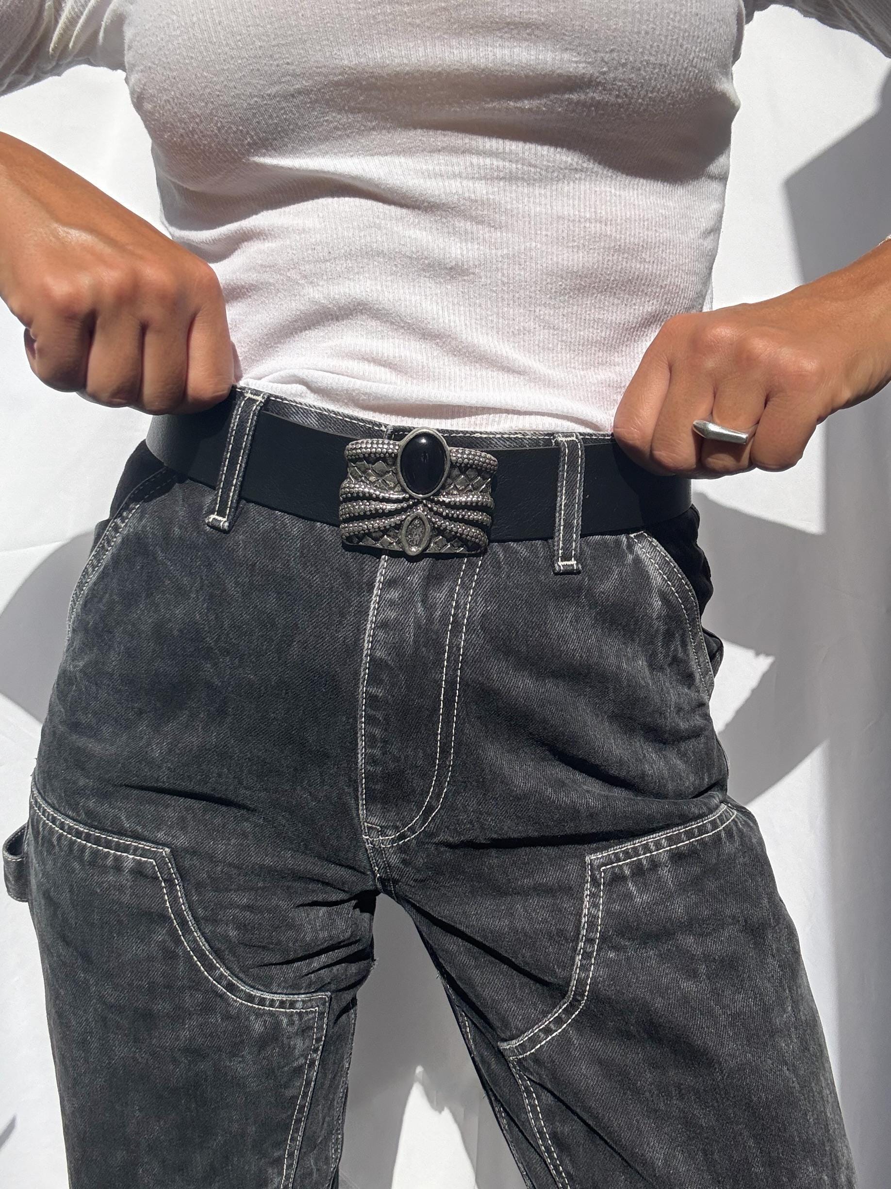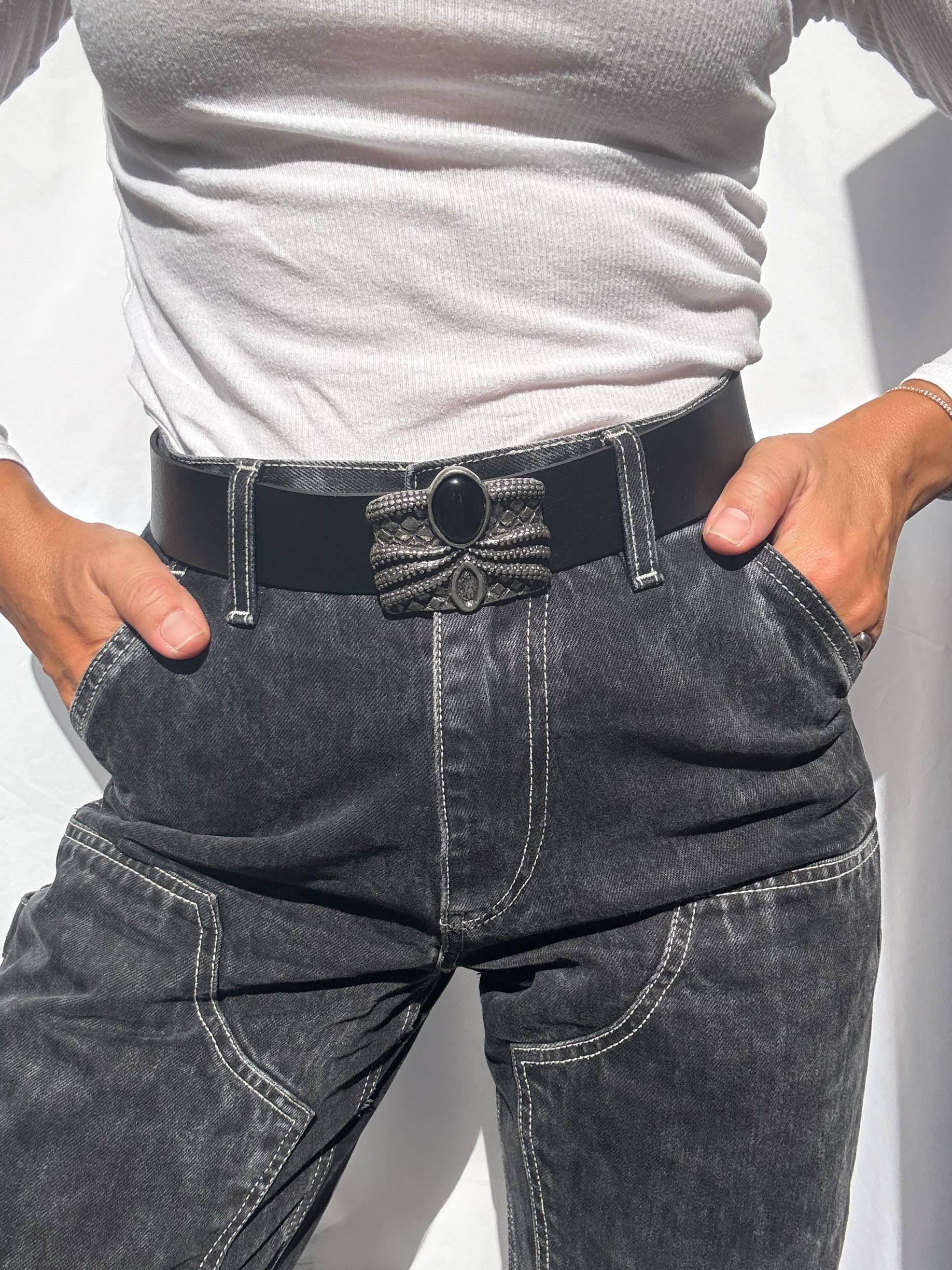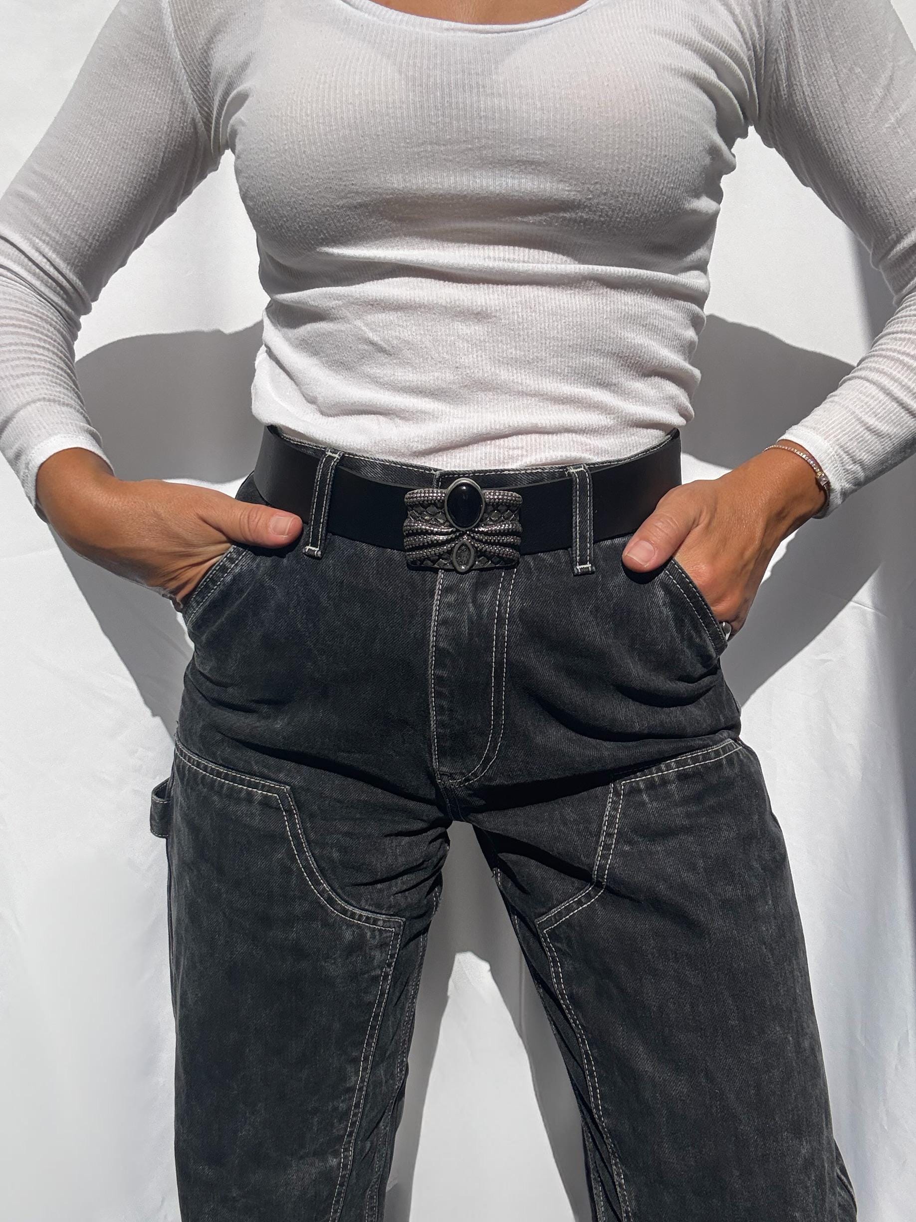 This handmade black leather belt features a unique silver boho-style buckle decorated with a glossy black stone. Crafted from genuine leather and 4 cm wide, it s perfect for jeans, dresses, or layering over blazers. A timeless, bold accessory for every boho-chic woman